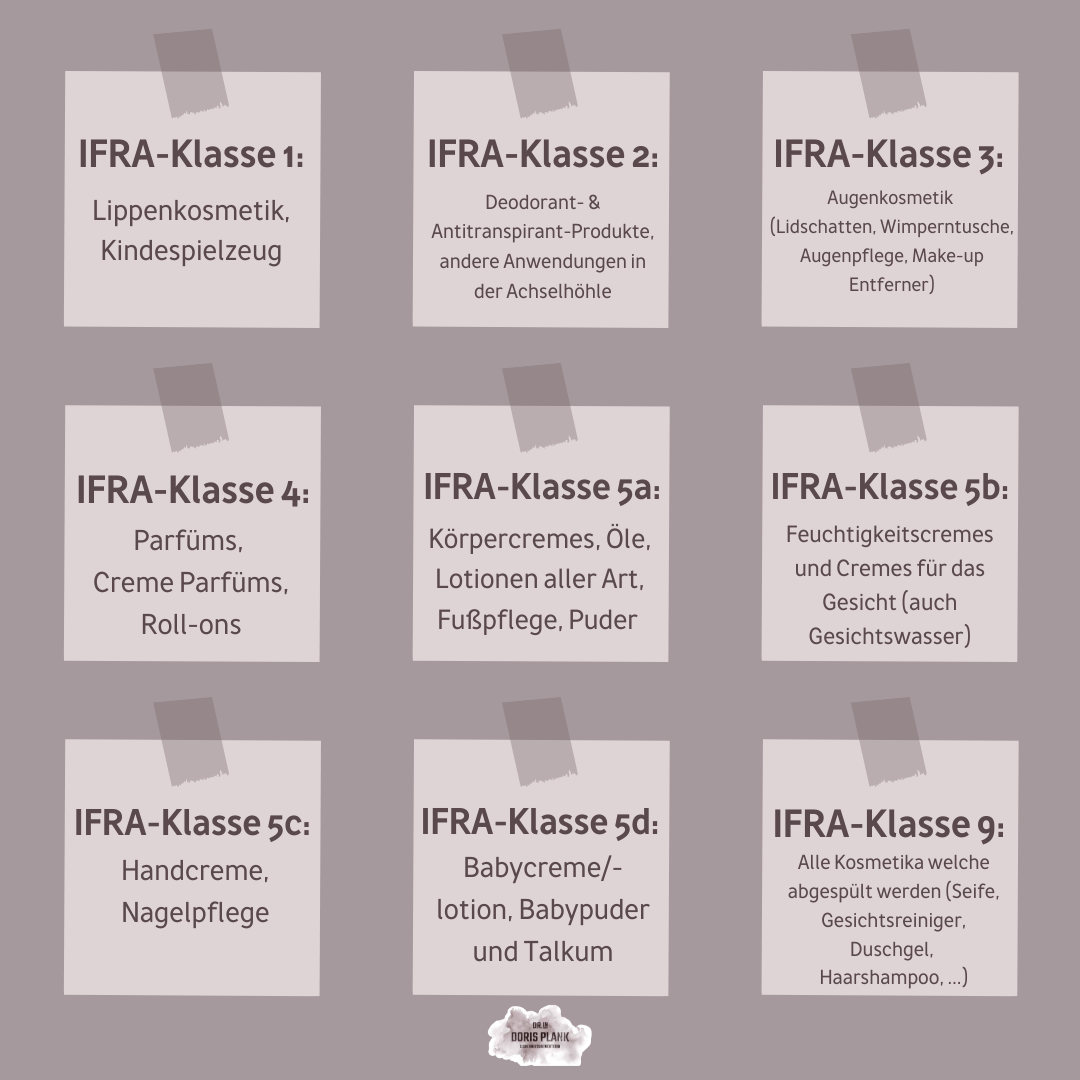 Einteilung der IFRA-Klassen (keine erschöpfende Auflistung der möglichen Produkte):